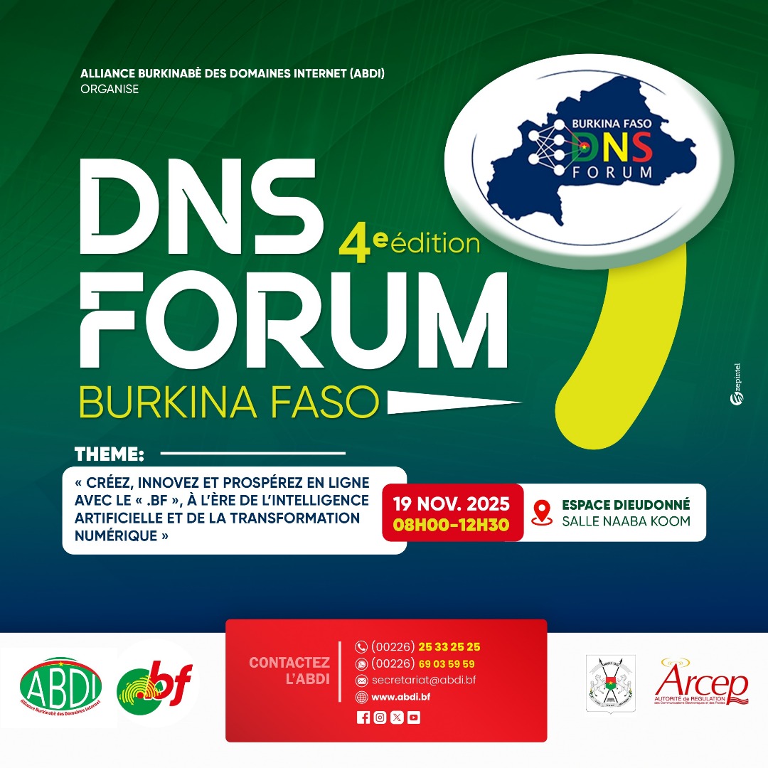 L’Alliance Burkinabรจ des Domaines Internet (ABDI) organise la 4e รฉdition du DNS Forum – Burkina Faso, un rendez-vous incontournable dรฉdiรฉ ร la promotion du .bf et ร la Gouvernance du systรจme des noms de domaine (DNS)